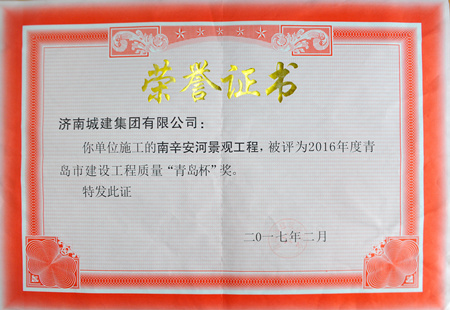 南辛安河景观工程被评为2016年度青岛市建设工程质量“青岛杯”奖