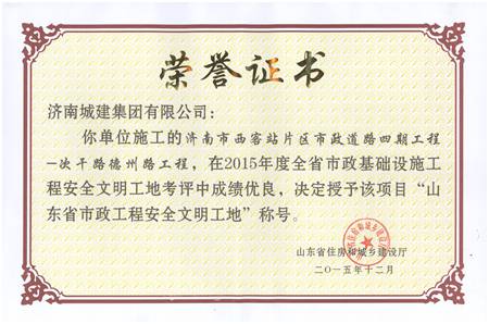 济南市西客站片区市政道路四期工程-次干路德州路工程荣获山东省市政工程安全文明工地称号