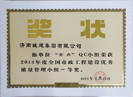 “金点”QC小组荣获2013年度全国市政工程建设优秀质量管理小组一等奖