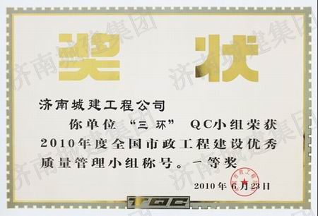 “三环”QC小组荣获2010年度全国市政工程建设优秀质量管理小组一等奖