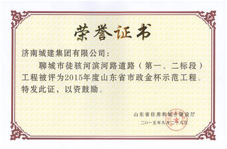 聊城市徒骇河滨河路道路(第一、二标段)被评为2015年度山东省市政金杯示范工程