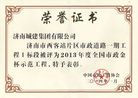 济南市西客站片区市政道路一期工程一标段被评为2013年度全国市政金杯示范工程