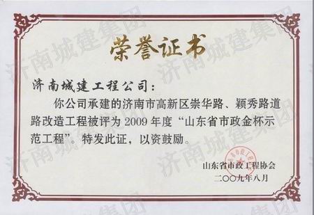 济南市高新区崇华路、颖秀路道路改造工程被评为2009年度山东省市政金杯示范工程