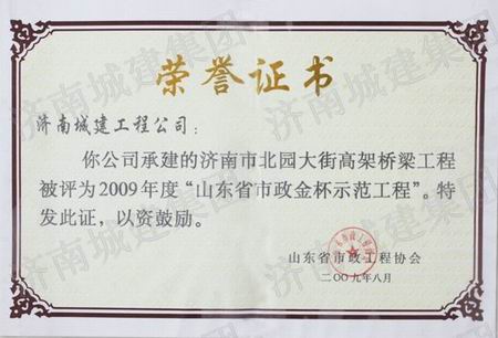 济南市北园大街高架桥梁工程被评为2009年度山东省市政金杯示范工程