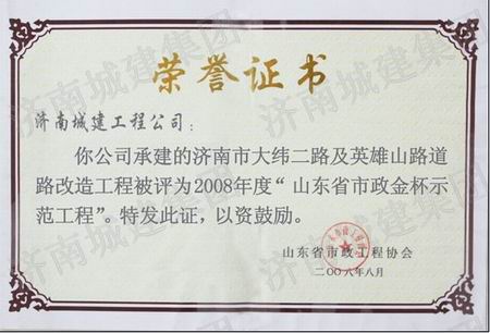 济南市大纬二路及英雄山路道路改造工程被评为2008年度山东省市政金杯示范工程