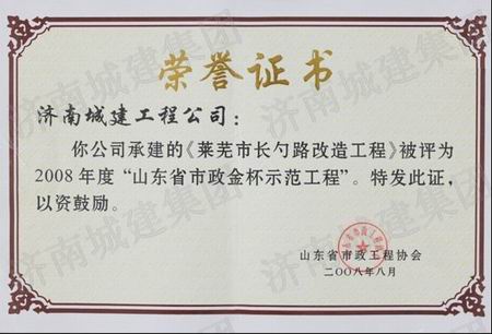 莱芜市长勺路改造工程被评为2008年度山东省市政金杯示范工程