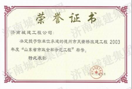 德州市天衢桥改建工程荣获2003年度山东省市政金杯示范工程
