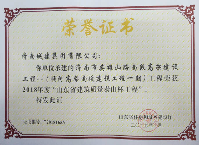 济南市英雄山路南段高架建设工程(顺河高架南延建设工程一期)工程被评为2018年度“山东省建筑质量泰山杯工程”