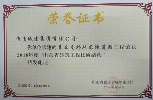 章丘南外环东延道路工程被评为2018年度“山东省建筑质量泰山杯工程”