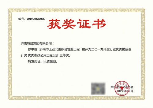 济南市工业北路综合管廊工程被评为2019年度行业优秀勘察设计奖优秀市政公用工程设计三等奖