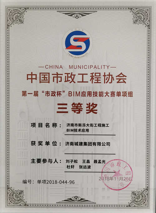 集团《济南市新泺大街工程施工BIM应用实践》荣获“第一届市政杯BIM应用技能大赛单项组三等奖”