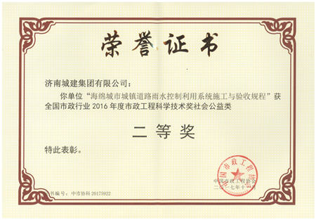 海绵城市城镇道路雨水控制利用系统施工与验收规程获全国市政行业2016年度市政工程科学技术奖社会公益类二等奖