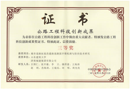 城市道路拓宽改建路基路面开裂机理与防治技术研究获公路工程科技创新成果三等奖