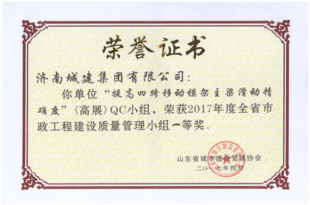 提高四跨移动模架主梁滑动精确度(高展)QC小组获2017年度全省市政工程建设质量管理小组一等奖