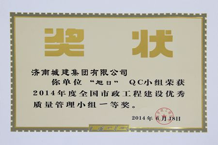 “旭日”QC小组荣获2014年度全国市政工程建设优秀质量管理小组一等奖