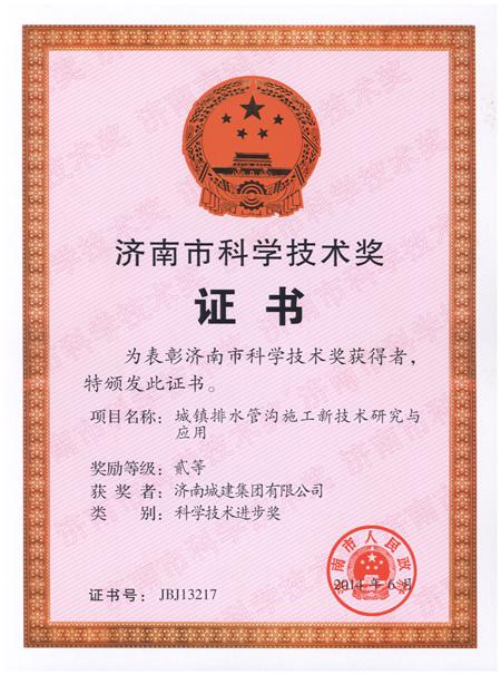 城镇排水管沟施工新技术研究与应用济南市科学技术奖贰等奖