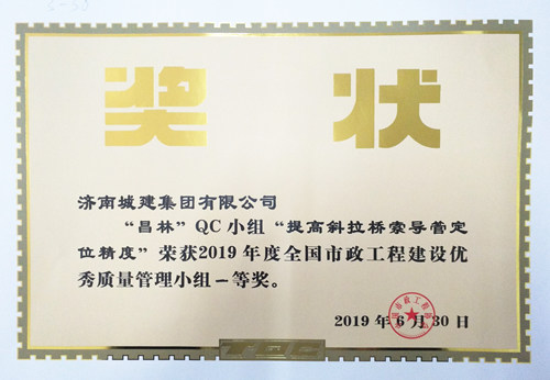 集团“昌林”QC小组《提高斜拉桥索导管定位精度》荣获“2019年度全国市政工程建设优秀质量管理小组一等奖”